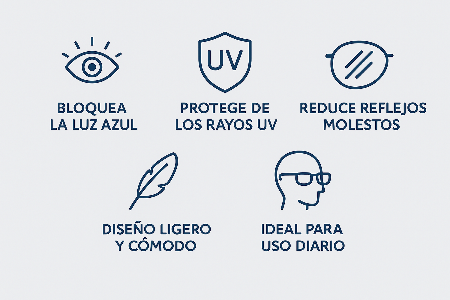 Lentes con filtro de luz azul, protección UV 400, capa antirreflejo y armazón premium.