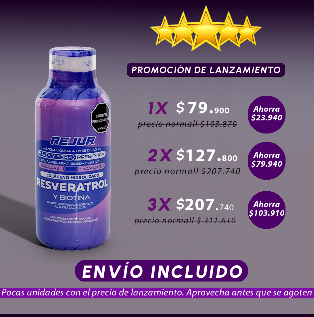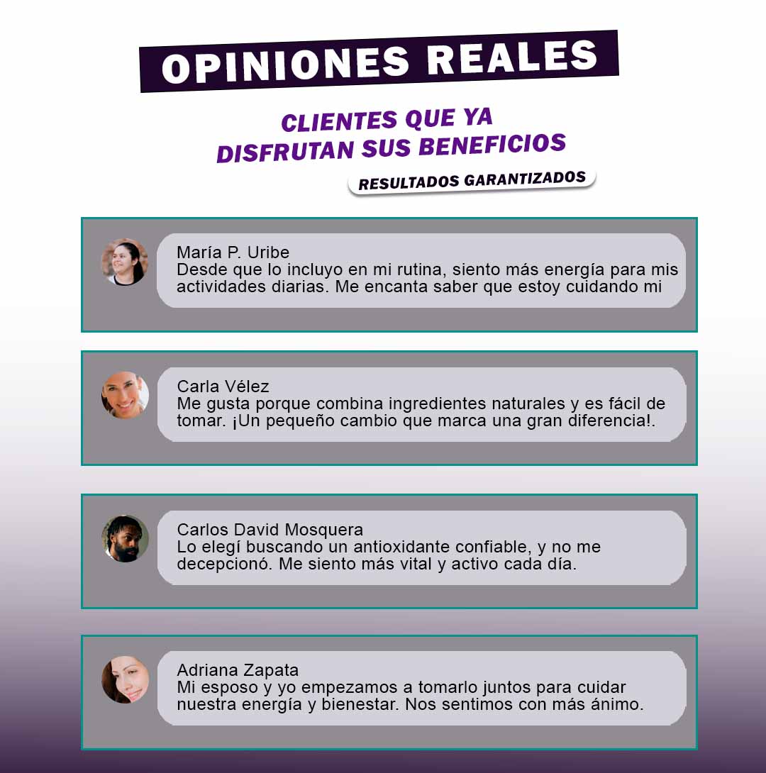 1. Vitalidad sin Límites: Despierta con energía y olvida el cansancio. 2. Enfoque Total: Libera tu mente y mantén la claridad todo el día. 3. Juventud en tu Piel: Luce firme, sin arrugas, como si el tiempo no pasara. 4. Escudo Antioxidante: Defiende tu cuerpo y siéntete joven cada día. 5. Corazón Fuerte: Protege tu circulación y vive con fuerza desde adentro.