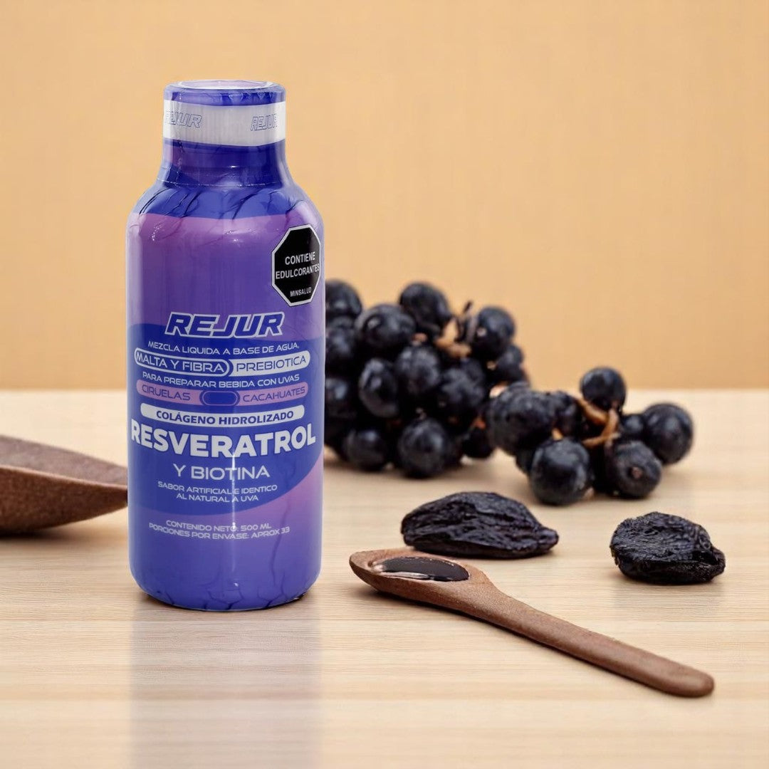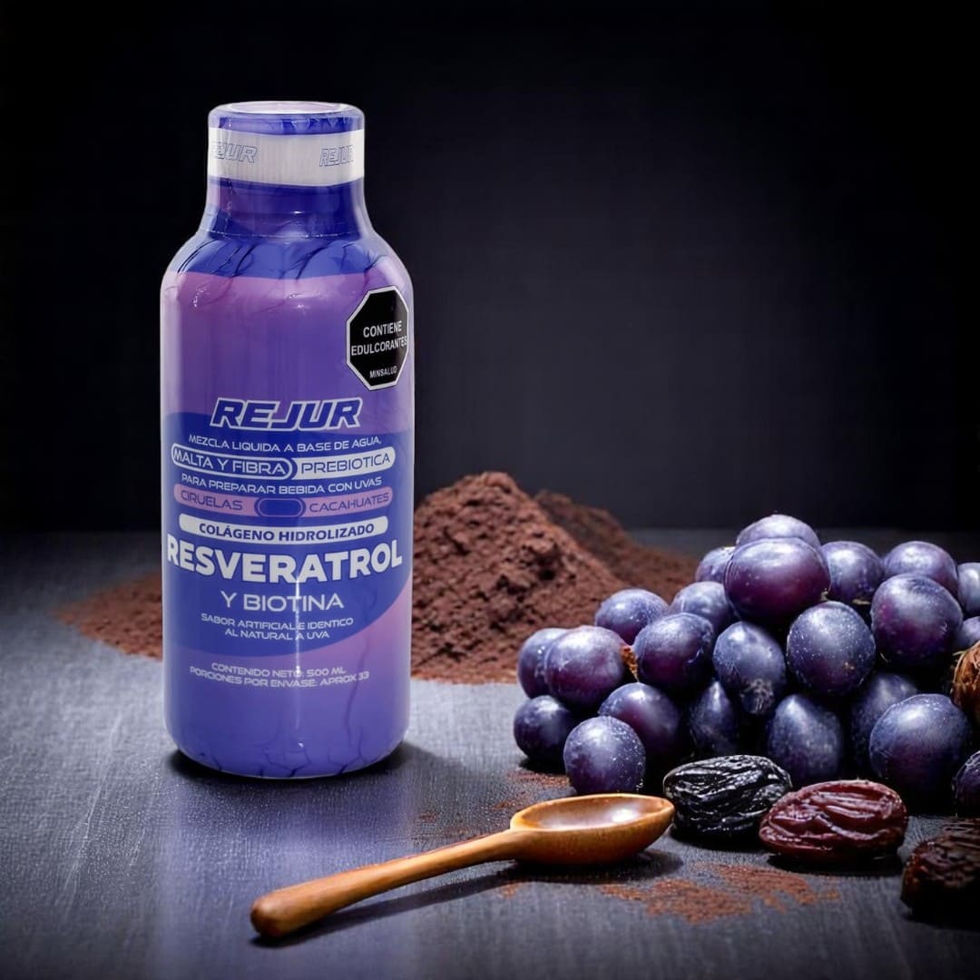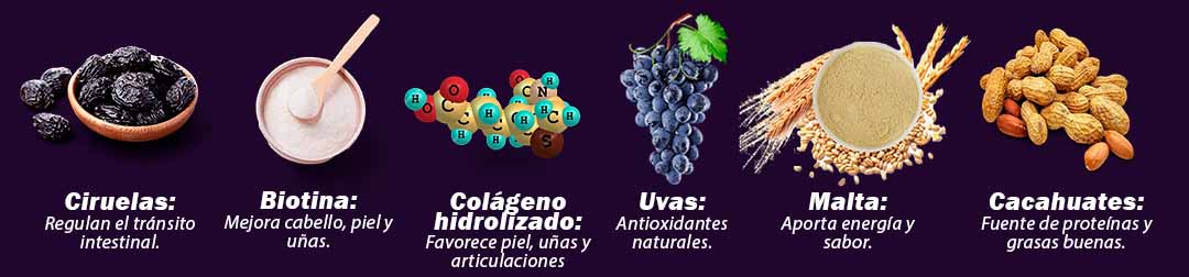 🍇 Uvas deshidratadas 🍑 Ciruela deshidratada 🥜 Cacahuates en polvo 🧬 Colágeno hidrolizado 💊 Resveratrol y biotina